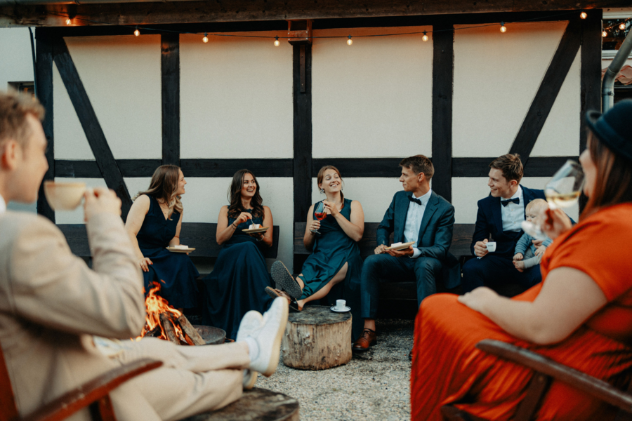 freudige Gäste auf der Terrasse hinter der Eventlocation